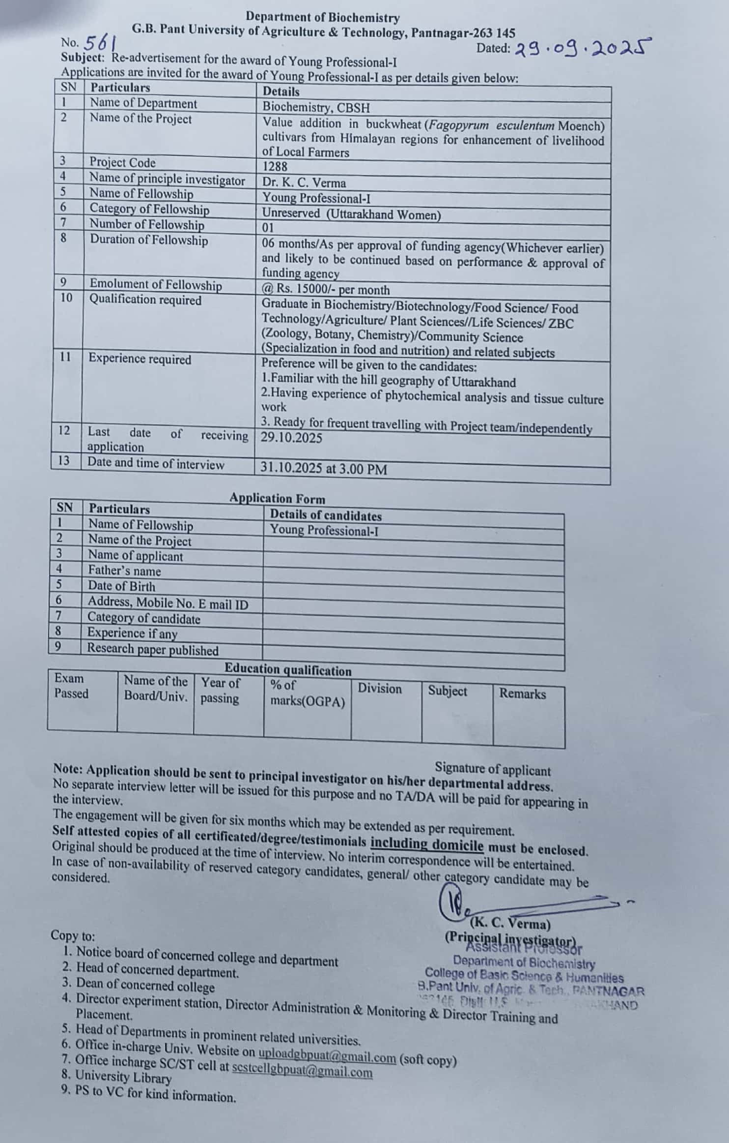 GBPUAT Recruitment 2025 Young Professional I (Department of Biochemistry) 1 Post Application Form